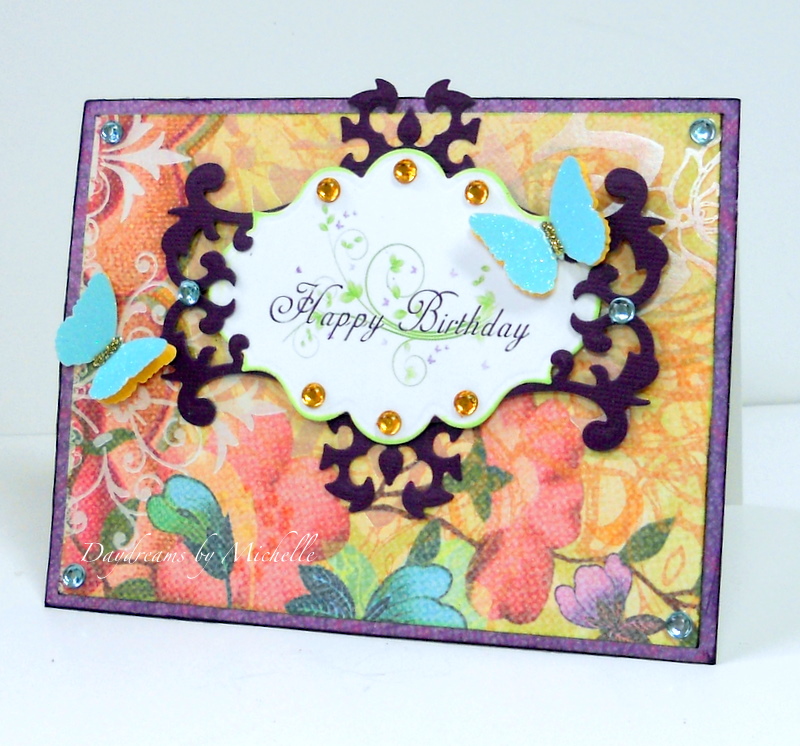 Here is a fun CAS card I made this week using one of the two new "Birthdays" images available today at M5D. I just could not resist the beautiful swirls and flutter-byes in this image! :) This image is really great for a quick card because it's already colored. (Sometimes birthdays sneak up on me and I'm really pressed for time). Once I printed it, I used Spellbinder Labels 20 and Spellbinders Fancy Tags 3 die~cuts to dress it up even more.